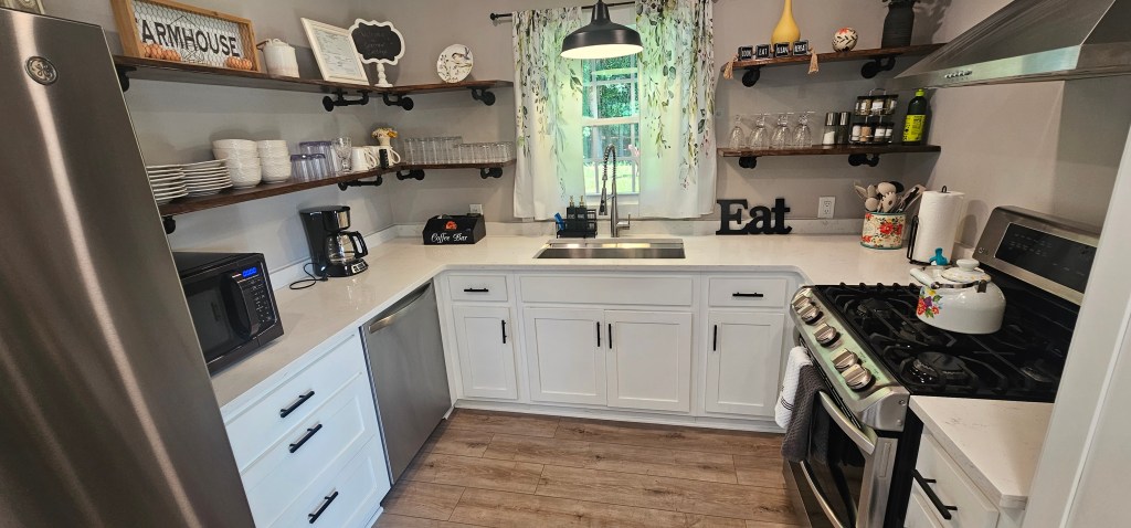 - Countertops, sink, stove, microwave, inside the refrigerator, cabinets, and floors.